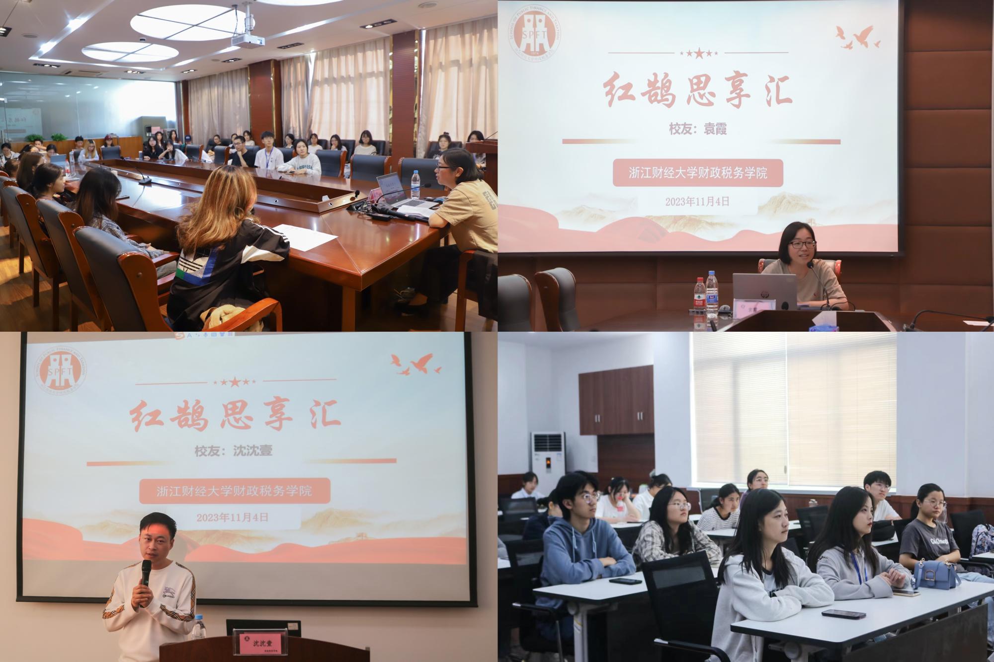 当天,学院还举办了“认领微心愿”活动暨星火基金年度总结会、红鹄思享汇和校友树木认捐仪式等活动。“认领微心愿”仪式上,广大校友积极参与认领,将拳拳爱校心转化为支撑学弟学妹们成长的切实行动,不断传递爱与温暖。在“红鹄思享汇”事迹分享座谈会上,优秀校友袁霞、沈沈壹作为主讲人分享了个人经验。袁霞校友通过强调精神富养的重要性,倡导同学们寻己所爱,发掘适合的人生模式。沈沈壹校友借助他一路向上的求学励志经历,鼓励正值青春的同学们不断奋斗。此外,学院还为1983届财政班、1993届税专班、2003届财政1班、2003届财政2班、2003届社保班、2003届税务班等6个班级举行了校友树木认捐仪式,学院领导与校友们一起挂牌浇水。一棵棵校友树承载着校友与母校的深情纽带,浓缩着校友对母校的由衷感恩,蕴含着对母校教育之树长青的真挚祝福。