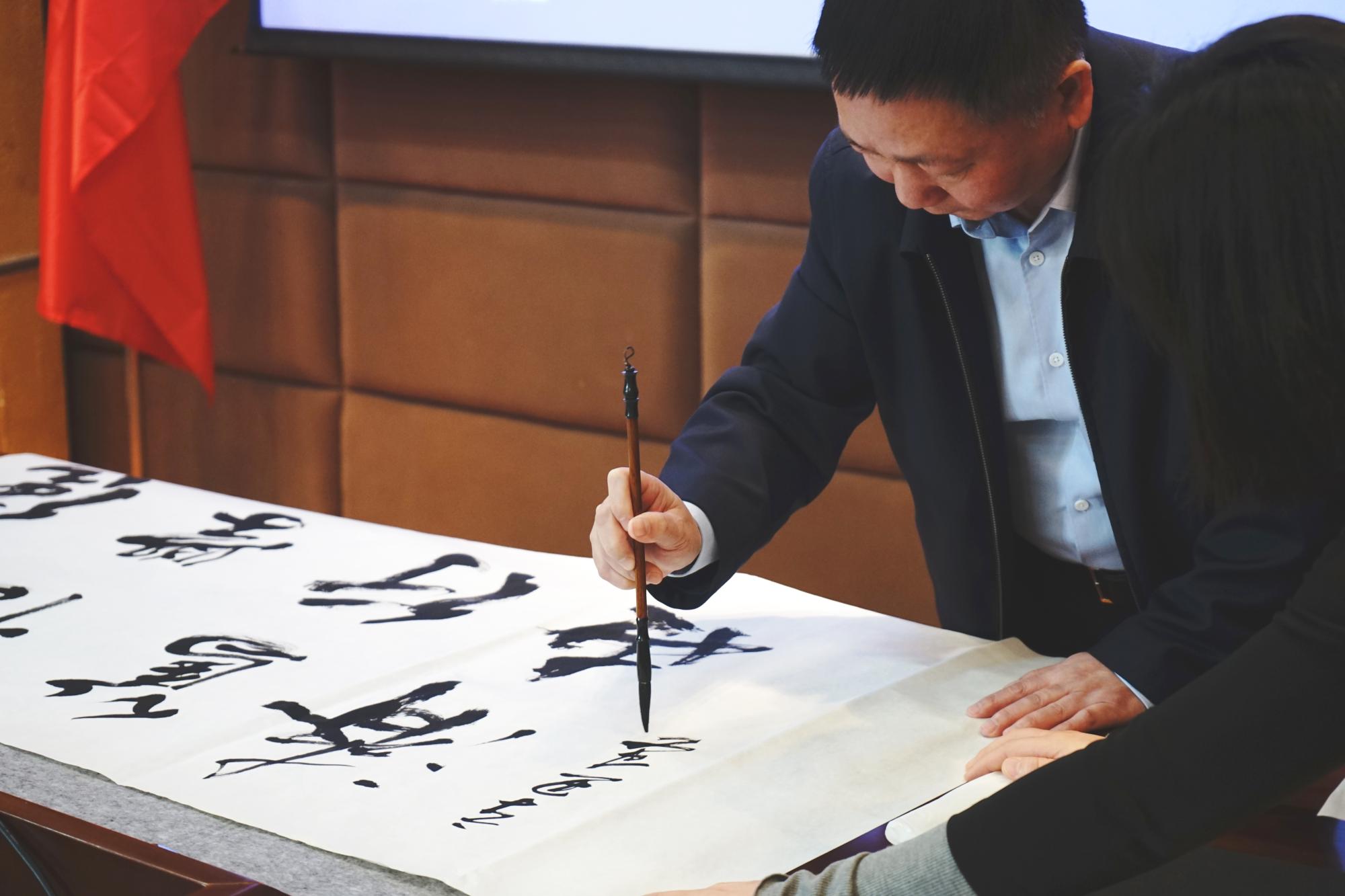 最后,杨灿明校长挥笔题写了我院院训“厚德博学,笃行济世”。