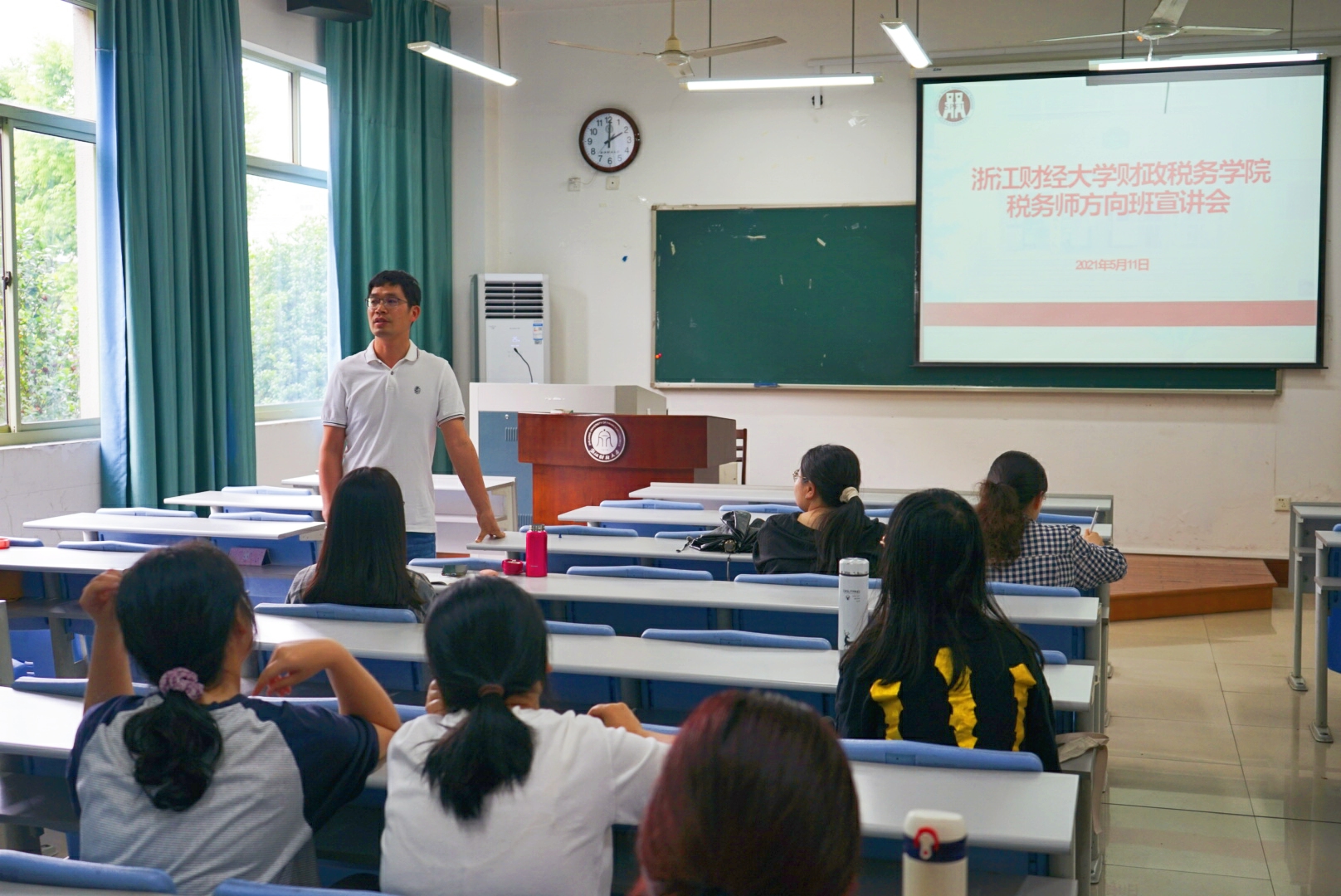 宣讲会伊始,张帆从税务师班的成立渊源、培养目标、课程构成三个角度详细说明了本班的具体情况。他指出“税务师方向班”将着重强化同学们对于税收实务等相关专业知识的掌握,锻炼提升实务操作能力,为社会培养与行业要求相接轨、日后有志于从事涉税服务及相关工作的应用型人才。税务师方向班是浙江省注册税务师协会与1946伟德国际源自英国进一步深化落实双方税务人才培养战略合作协议的重要举措,在省税协的指导和大力支持下创立。入选本班的学生需在修读原专业培养方案的前提下,参加本班规定的税务师相关课程学习。“税务师方向班”是对我们学院现有税务人才培养的补充,也是进一步落实产学研综合培养的新尝试。