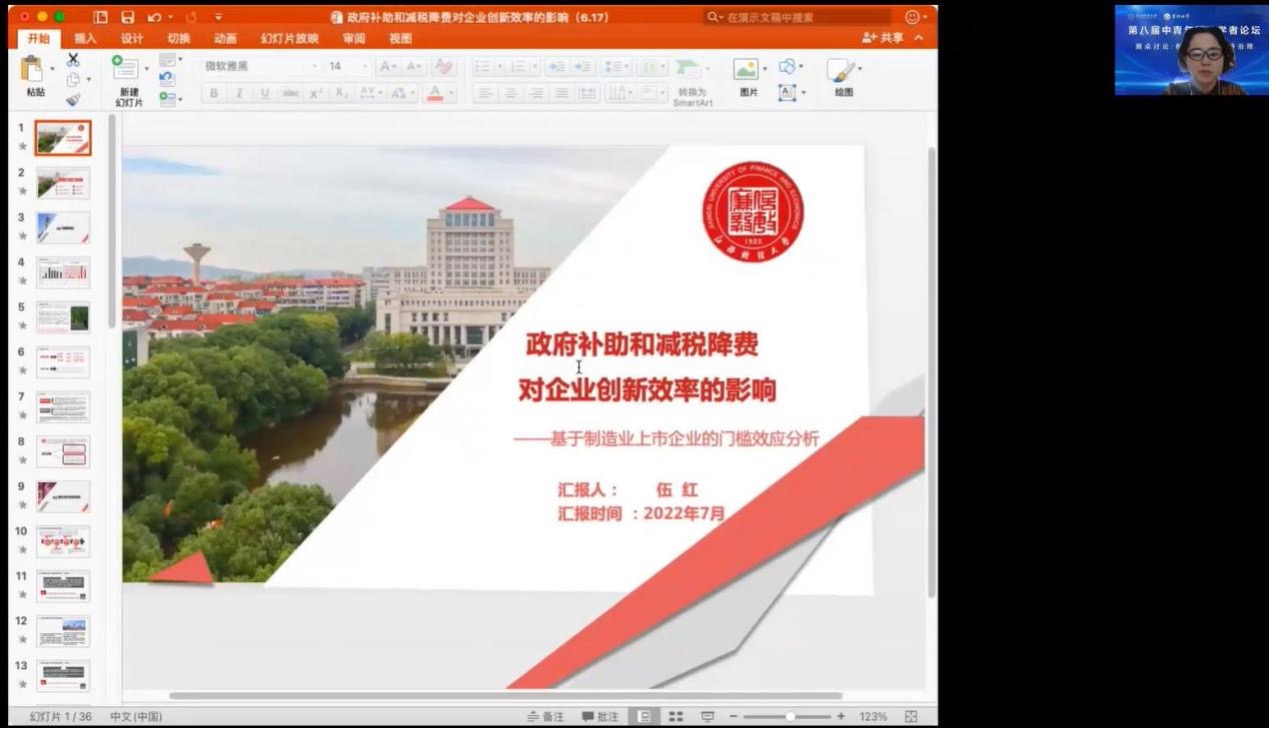 伍红教授的发言题目是“政府补助和减税降费对企业创新效率的影响”。她研究发现,提高政府补助及降低企业实际税费负担率,对制造业企业的创新效率均有正向激励作用,且政府补助存在门槛效应,据此提出了一系列建议。