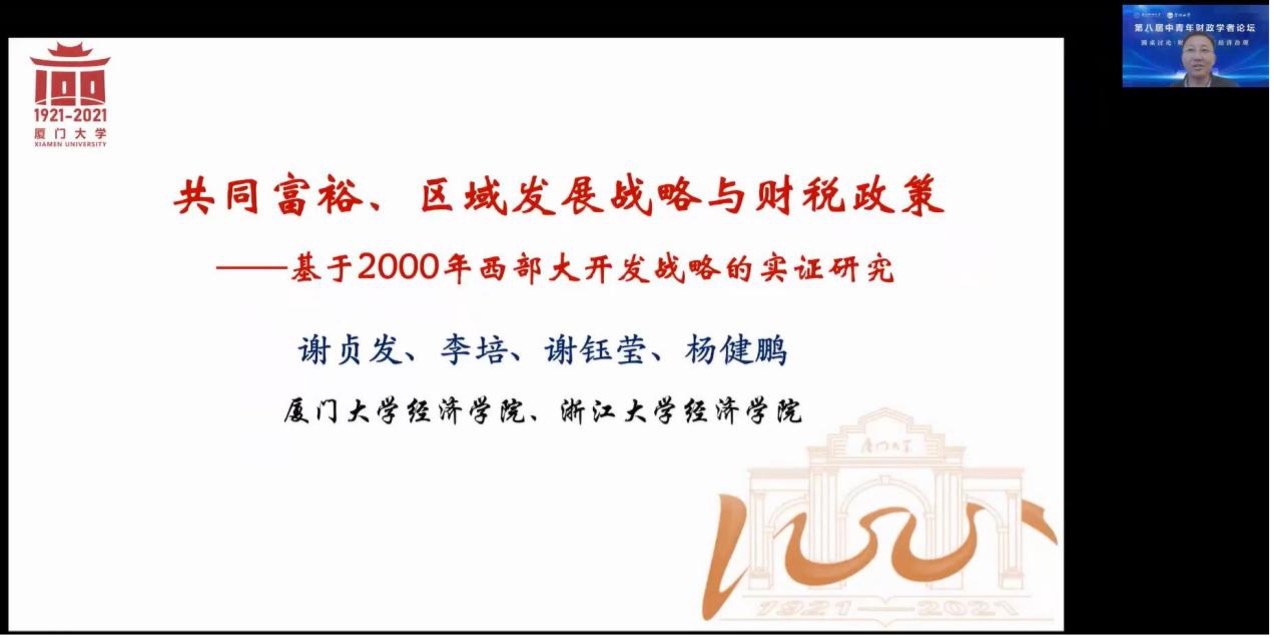 谢贞发教授的发言题目是“共同富裕、区域发展战略与财税政策”。他提出,应注重对地区重大发展战略促进区域内部协调发展及共同富裕效果的研究。研究表明,西部大开发战略通过增加基础设施投资建设及地区内部贸易,使得西部地区内部经济发展差距显著缩小,地区内实现了更平衡的发展。