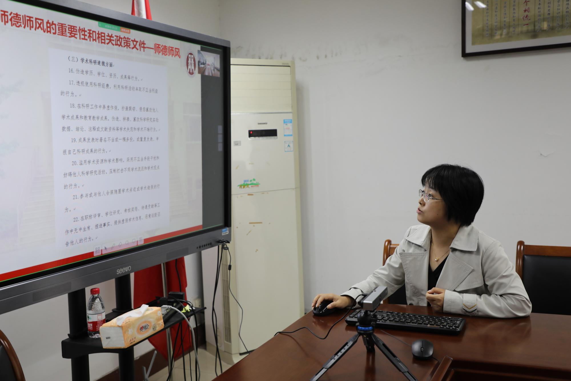 学院党委副书记、纪委书记徐丽玲结合《全省教育系统违纪违法典型案例汇编》,从师德师风重要性和相关政策文件解读、违反高校教师职业行为典型案例介绍、各类安全提醒三个方面展开讲解。她强调,学院全体教职工要以案为鉴,以学促改,提高思想认识,严防师德失范行为发生。